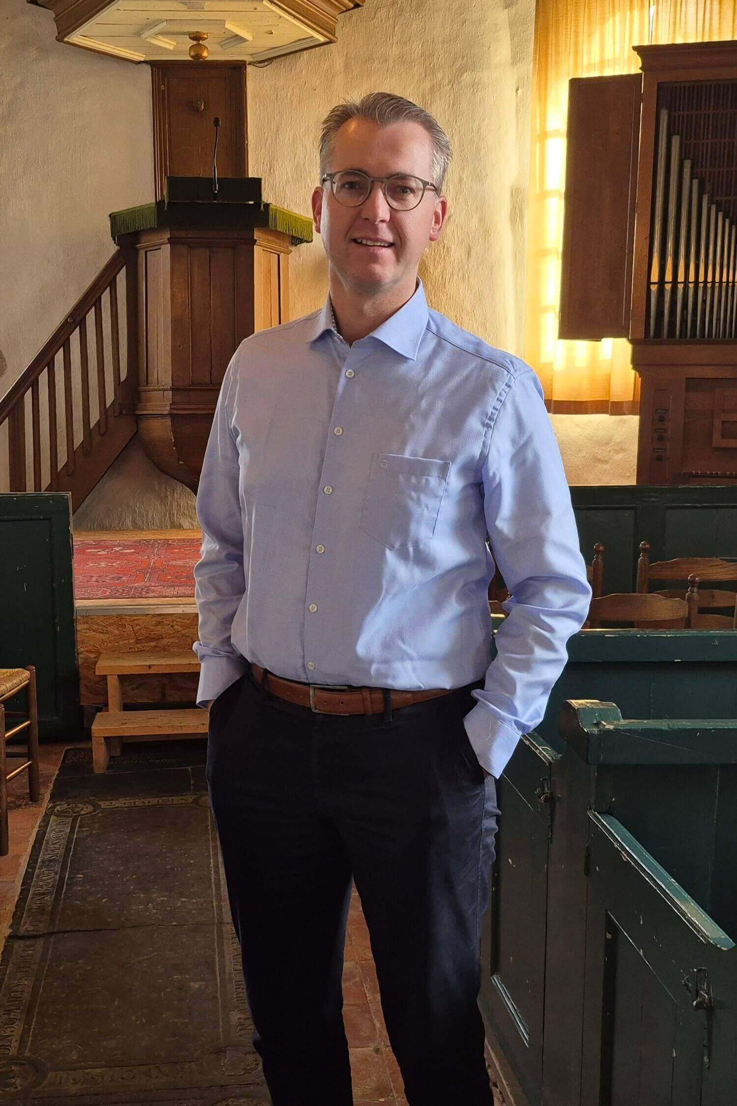 Het interview vindt plaats in de bankjes van de Kloosterkapel in Sibrandahûs. Hoewel Kooistra veel in kerken te vinden is, doet het hem iedere keer nog iets. „Stapst in gebou yn mei in beskate hillichheid", zegt hij.